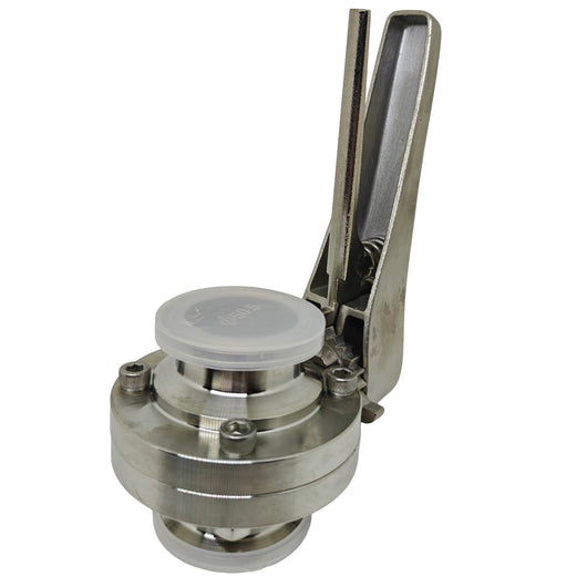 Nerūdijančio plieno SS304 sanitarinis „duckbill“ tipo drugelio vožtuvas su Tri Clamp jungtimi ir trigerio rankena greitam atidarymui ir uždarymui. Dydis 1.5". Tinka srauto valdymui higieninėse vamzdynų sistemose.